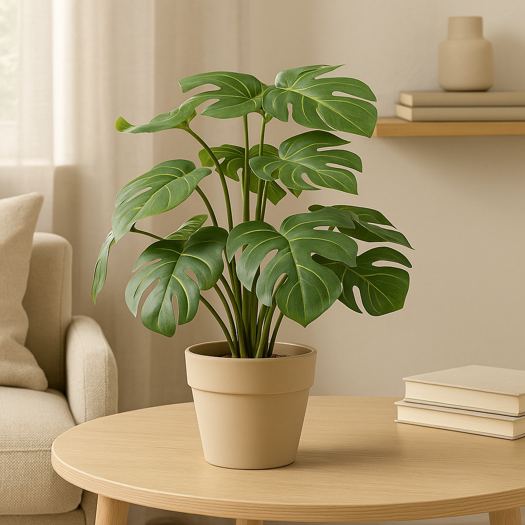 Diese künstliche Monstera bringt tropisches Flair und natürliche Eleganz in jeden Raum. Die detailreich gestalteten, großen Blätter mit realistischen Blattadern verleihen der Pflanze ein besonders authentisches Erscheinungsbild. Durch den stabilen schwarzen Topf lässt sich die Kunstpflanze vielseitig platzieren – ob als Blickfang im Wohnzimmer, im Büro oder in öffentlichen Bereichen. Die Monstera überzeugt durch hochwertige Materialien, die Langlebigkeit und Formstabilität garantieren – ganz ohne Pflege, Wasser oder Sonnenlicht. Sie ist ideal geeignet, um Räumen dauerhaft Frische und Stil zu verleihen und lässt sich hervorragend mit anderen Grünpflanzen kombinieren.