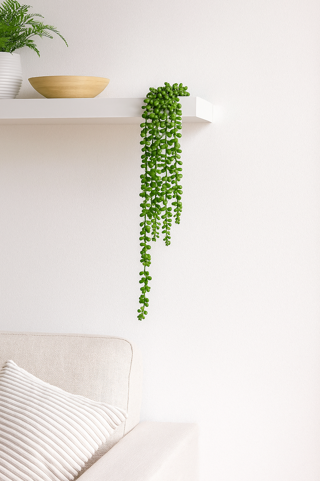 Diese künstliche hängende Sukkulente, auch bekannt als Perlenkette oder „String of Pearls“, verleiht jedem Raum eine frische und natürliche Atmosphäre. Die feinen, runden Blätter und die sanft herabfallenden Ranken wirken besonders lebensecht und bringen Bewegung sowie Struktur in jede Dekoration. Ideal geeignet für hängende Gefäße, Wanddekorationen, Regale oder Pflanzenampeln. Die hochwertige Verarbeitung sorgt für eine realistische Optik und eine lange Lebensdauer – ganz ohne Pflege, Licht oder Wasser. Diese dekorative Kunstpflanze fügt sich harmonisch in Wohnräume, Büros oder öffentliche Bereiche ein und ist vielseitig kombinierbar mit anderen Sukkulenten oder Kunstpflanzen.