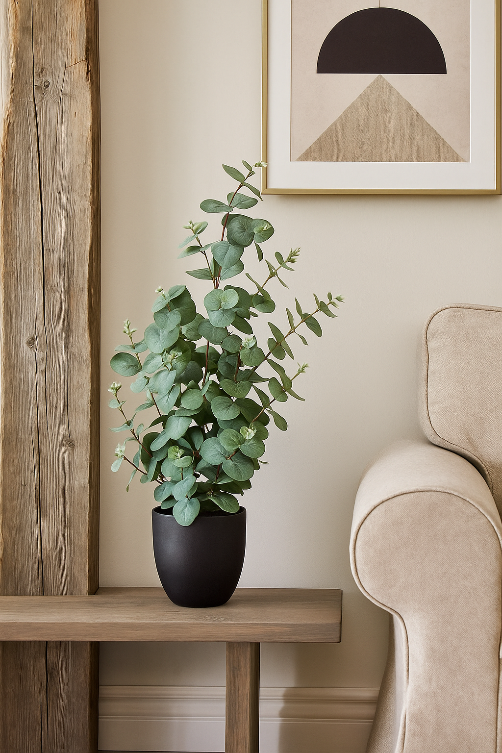 Dieser künstliche Eukalyptus im Topf besticht durch sein dichtes, rundes Blattwerk und die harmonische Farbgebung in sanften Grüntönen. Die realistische Verarbeitung verleiht der Pflanze ein natürliches Erscheinungsbild, das mediterrane Frische und Leichtigkeit in jeden Raum bringt. Ob im Wohnbereich, Büro oder Eingangsbereich – der Eukalyptus setzt stilvolle Akzente und schafft ein ruhiges, ausgewogenes Ambiente. Dank der hochwertigen Materialien bleibt die Pflanze dauerhaft formstabil und farbecht – ganz ohne Pflegeaufwand oder Gießen.