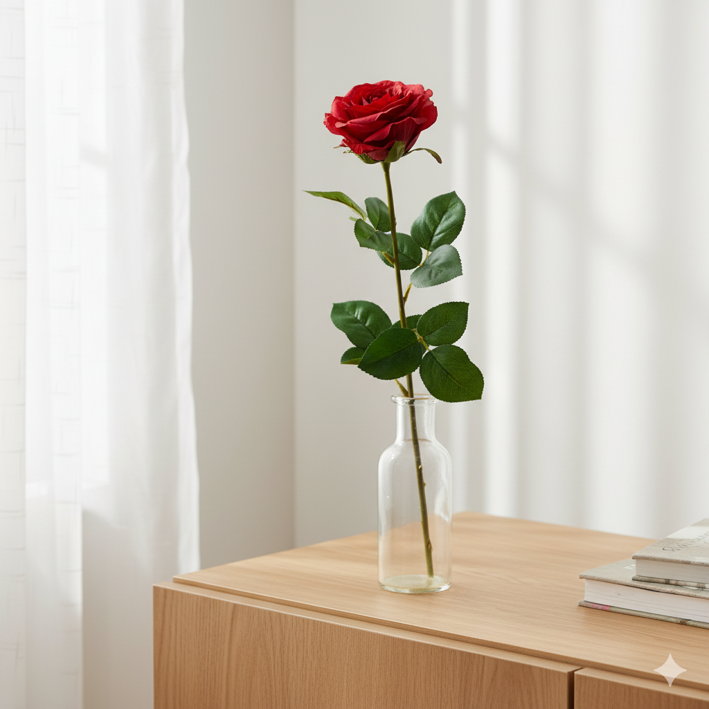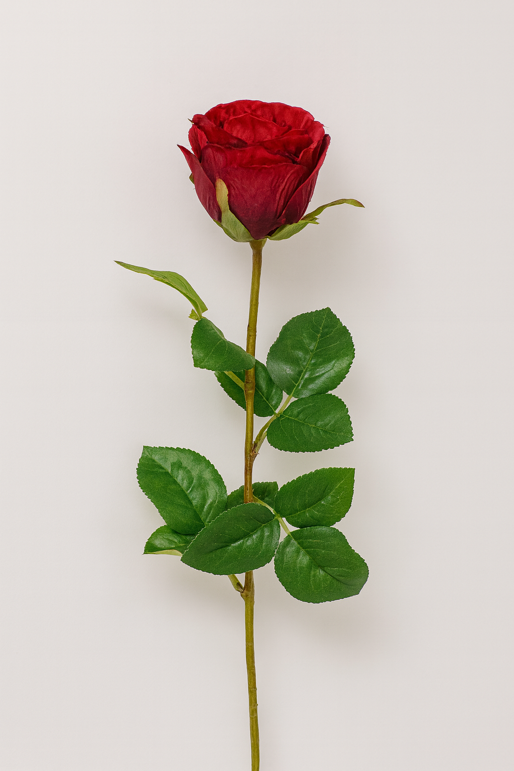 Diese täuschend echte rote Kunstrose vereint zeitlose Eleganz mit langlebiger Qualität. Ihre samtigen Blütenblätter, der naturgetreue Stiel und die detailreichen Blätter machen sie zu einem echten Blickfang in jedem Raum. Ideal als Einzelblume in einer Vase oder als Bestandteil eines Straußes.