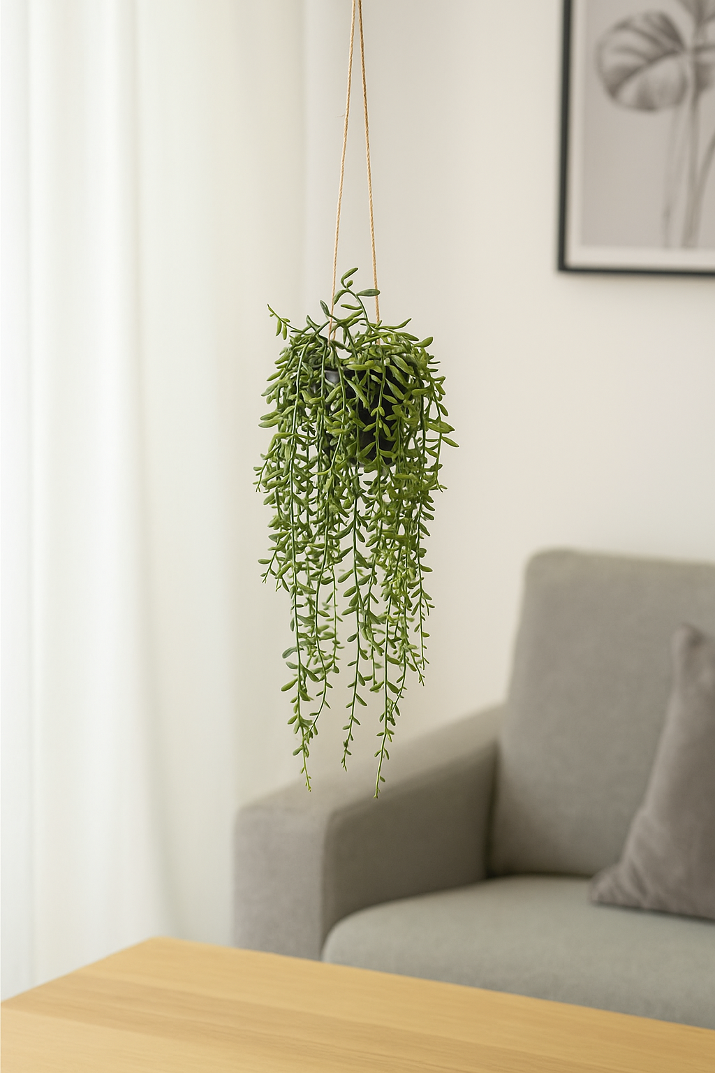 Diese künstliche hängende Sukkulente bringt frische Natürlichkeit und stilvolles Grün in jeden Raum. Die langen, filigranen Ranken und die lebensechte Farbgestaltung verleihen der Pflanze ein natürliches Erscheinungsbild. Dank der praktischen Aufhängung lässt sich die Kunstpflanze flexibel an der Decke, an Regalen oder in Fenstern platzieren – ideal für moderne Wohnräume, Büros oder überdachte Außenbereiche. Die pflegeleichte Sukkulente bleibt dauerhaft schön und formstabil, ohne Licht oder Wasser zu benötigen. Sie eignet sich perfekt als stilvolles Dekoelement, um Innenräume lebendig und einladend zu gestalten.